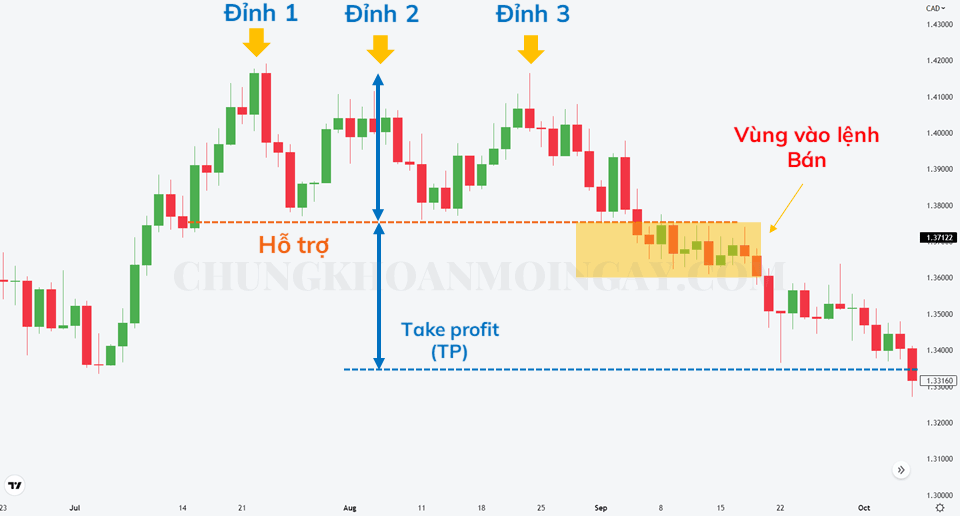 Chúng ta sẽ canh Bán khi mô hình giá Ba Đỉnh xuất hiện trong biểu đồ trên. Tại đường hỗ trợ (Support) giá đã phá qua, chúng ta sẽ đặt lệnh Bán ngay thời điểm giá phá qua đường này. Đối với mục tiêu lợi nhuận, chúng ta đo khoảng cách từ đỉnh sóng (swing) đến mức hỗ trợ để thoát khỏi thị trường.